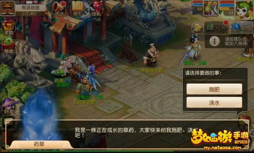 玩家在活动时间内进入帮派地图后,就会看到在帮派地图上刷新出了一定数量的药草(通常为5~6个)。点击药草,会出现三个选项,分别是施肥、浇水、除虫。点击其中任一选项,你就能够获得一个二级药和一点帮贡。