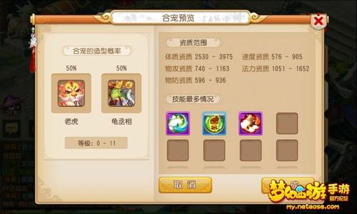 玩家可以点击“预览”来查看两只召唤兽合成后可能获得的资质和召唤兽技能,从而对成品有一个更直观的预测标准。