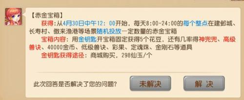从4月30日中午12:00开始,每天8:00-24:00的每个整点在建邺城、长寿村、傲来渔港等场景随机投放一定数量的赤金宝箱。
