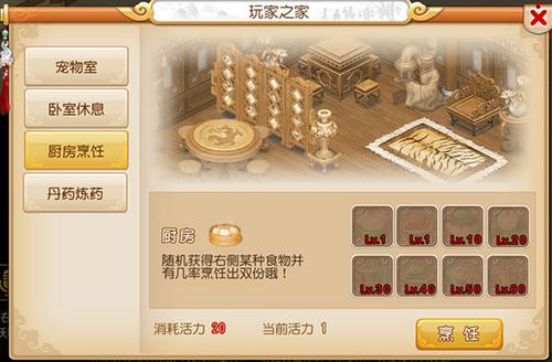 其次如果你学了烹饪或者炼药,肯定会希望要一个厨房或者丹房,除了它能够制造双倍产品之外,笔者自己花了1000活力之后感觉丹房对炼药成功率也有一定加成。