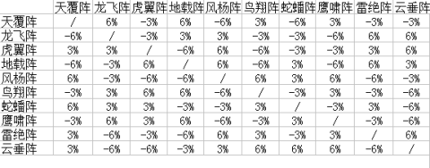 风杨阵:另一3输出2辅助阵法,3个输出位2个速度位。虽然大克了天阵,但是被虎大克龙小克,所以目前不多见。优点:大克天阵。缺点:被虎阵大克龙阵小克。