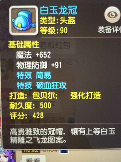 在梦幻西游手游中,一件头盔如果带破血特技,那么就算是极品。如果带破血还带简易,那么就能称得上是神器。 点评:由于有卡89级的原因,90级简易装备的价值非常的高。而这头盔不仅拥有简易,还有最值钱的特技破血!!可以说很长一段时间内没哪个头盔能超越他了。