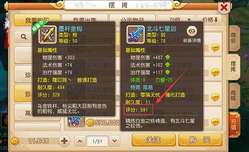 在梦幻西游手游中,评分的用处只有一个——上榜装B,而在评分中,武器的评分是在所有的评分中占的比例是非常高的。下面小编就来为大家说明下决定武器评分的因素。 首先说明下如何查看武器的评分: 主界面→包裹,点击某武器就可以查看评分了。 影响评分的因素: 1、武器的基础属性,可通过强化打造来获得更高的属性。 2、镶嵌的宝石,提升附加属性。 3、附加的特技。c