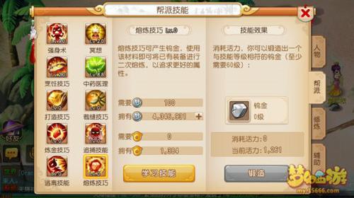 打开帮派技能界面,你会发现多出了一个帮派技能--“熔炼技巧”。通过不断升级熔炼技巧技能,从而可以锻造出钨金。使用锻造出来的钨金,可以为装备附加熔炼属性。