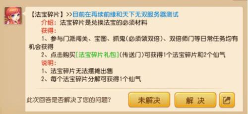 2.法宝碎片是不能交易的,但是是可以分解成仙气的。1碎片=1仙气(1仙气相当于12W银币)。