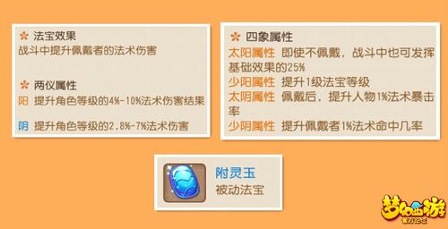 附灵玉:战斗中提升佩戴者的法术伤害。四象属性一般是选择少阳,提升1级法宝等级就相当于直接提升伤害。土豪会选择太阴,提升1%的法术暴击率。