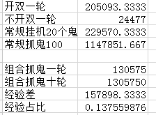 第五种,普通9只,领双1只。根据假设,一轮抓鬼经验为4.6万。而根据规则,计算得到每天可进行11轮9/1+3轮双倍+1轮1/9抓鬼,计算后得到经验为83.08万。