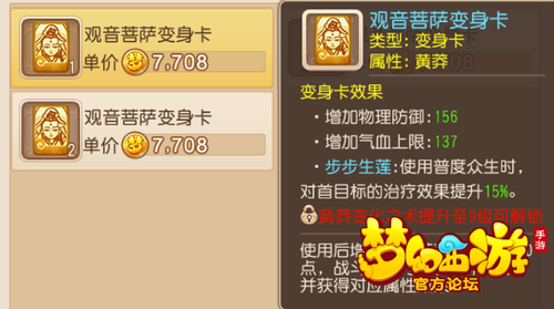 5.普陀,第一种观音菩萨变身卡黄莽9级卡。效果:增加物理防御 等级*1.6+增加气血上限等级*1.5,步步生莲:使用普度众生时,对首目标的治疗效果提升15%。PK的时候经常会出现残血状态,能够跟地府进行更好的分工,普陀专注于个体回复,地府注重于群体回复,普陀救治大唐点杀单位,地府回复狮驼龙宫这种群伤单位。