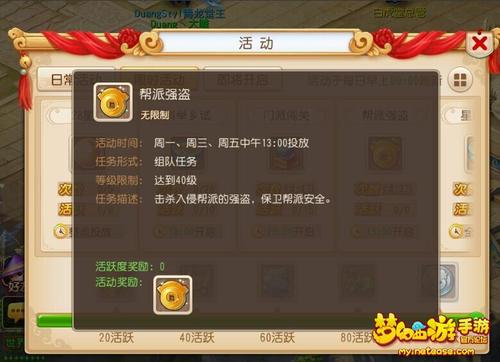 相信小伙伴们都已经加入帮派了!每周的一,三,五会有帮派强盗活动,也是每个小伙伴必做的活动。